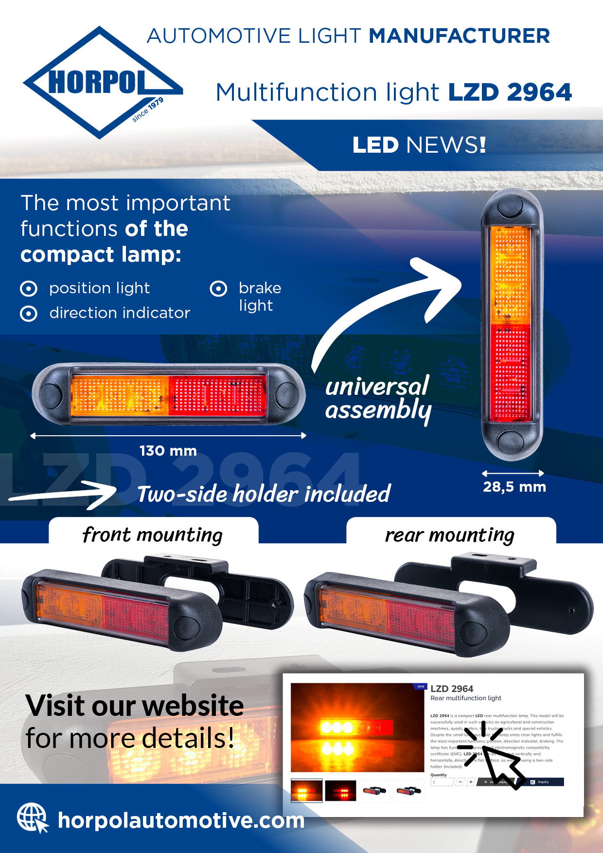 LZD 2964 is a compact LED rear multifunction lamp. This model will be successfully used in such vehicles as agricultural and construction machines, quads, trailers, tow trucks, trucks and special vehicles. Despite the small luminous field, the lamp emits clear lights and fulfills the most important functions: position, direction indicator, braking. The lamp has European approval and electromagnetic compatibility certificate (EMC). LZD 2964 can be mounted vertically and horizontally, directly to a flat surface, as well as using a two-side holder (included).
